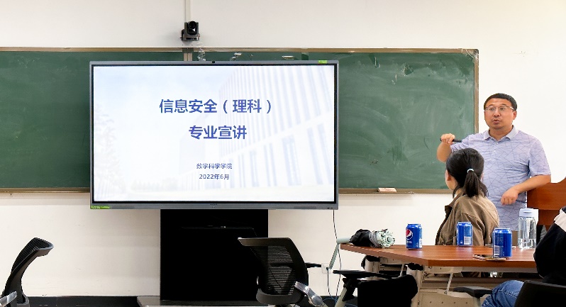 应用数学系教师韦卫从发展历史、培养目标、课程设置三方面介绍了信息安全(理科)专业。应用数学系教师王海辉、杨卓琴、严夺魁、王进良分别介绍了各自的研究方向,并与同学们进行了深入交流。
