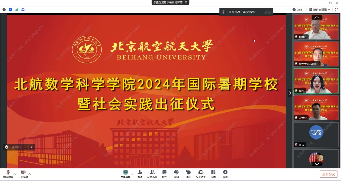 7月19日晚,数学科学学院2024年国际暑期学校暨社会实践出征仪式于线上会议平台进行。学院院长韩德仁、党委副书记魏茜,暑期学校带队教师代表张世金、李田田、陆筱,社会实践队指导教师代表程乾,国际暑期学校和社会实践队学生代表等近60人参加仪式。本次出征仪式由魏茜主持。